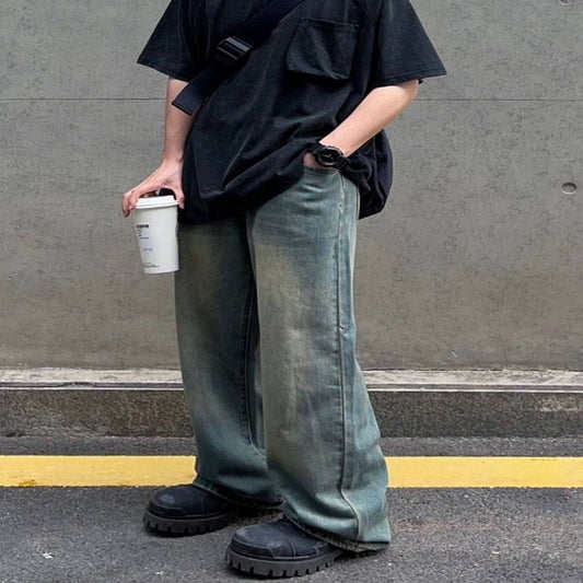 Pants Men Vintage Wash Cotton Deep Blue High Waist