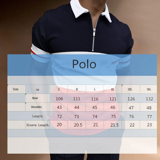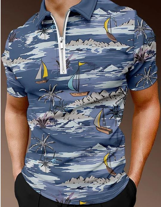 Men's Casual Short Sleeve Digital Print Zip Pullover Men's Polo Shirt