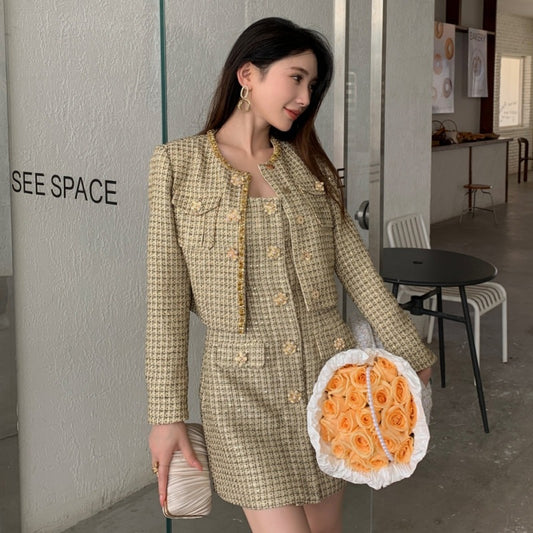Classic Style Tweed Heavy Industry Rhinestone Lace Sleeveless Vest Dress
