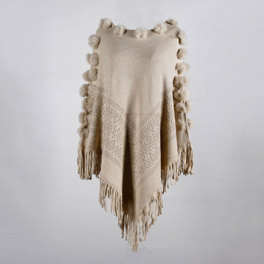 Fringed Cloak Shawl Hair Ball Round Neck Pullover Solid Color Sweater Women