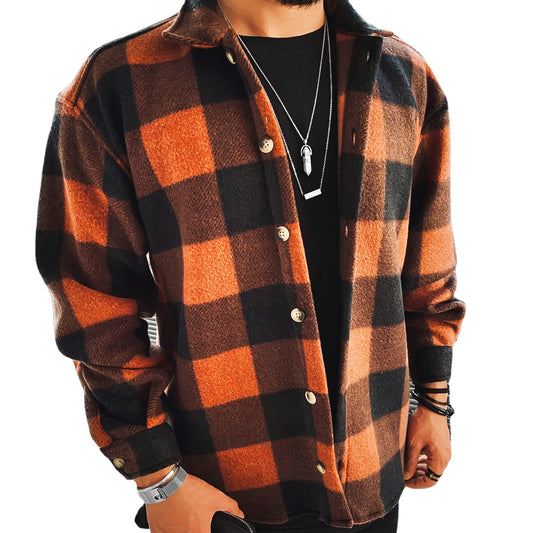 Long-sleeved Plaid Long-sleeved Shirt Casual Stand Collar Pocket Shirt Men