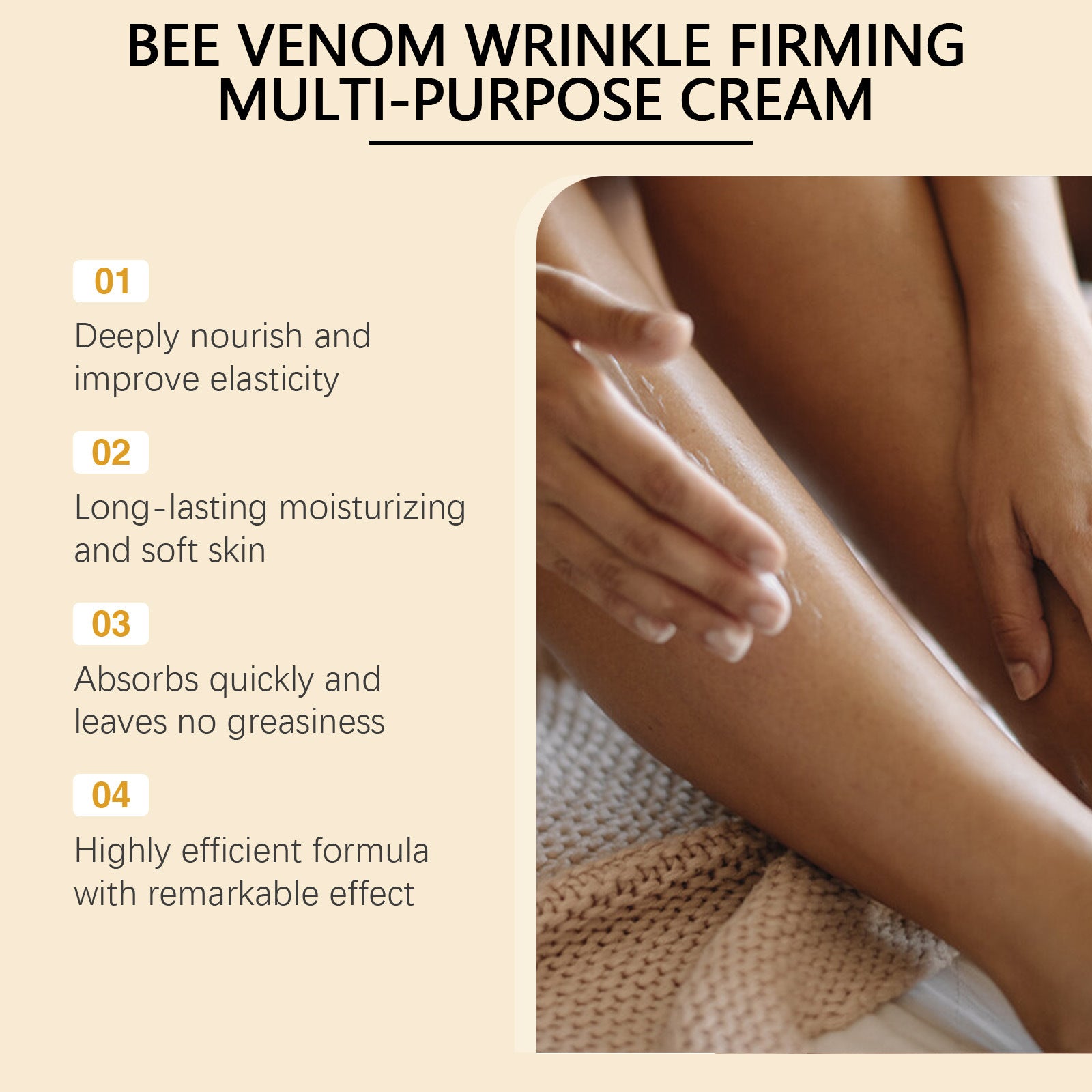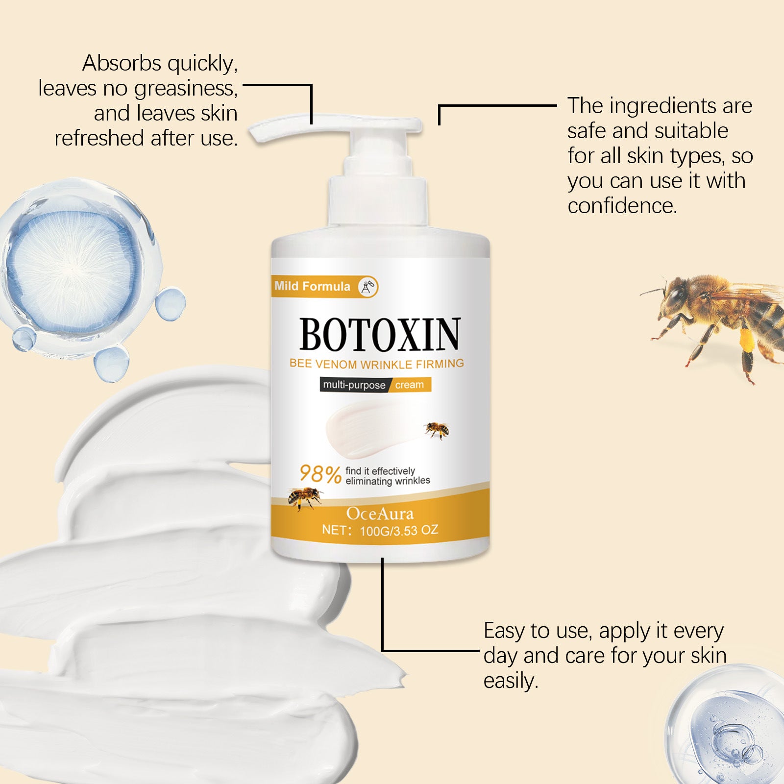 Product Ingredients: bee venom, copper tripeptide-1, nicotinamide, hyaluronic acid, etc.
